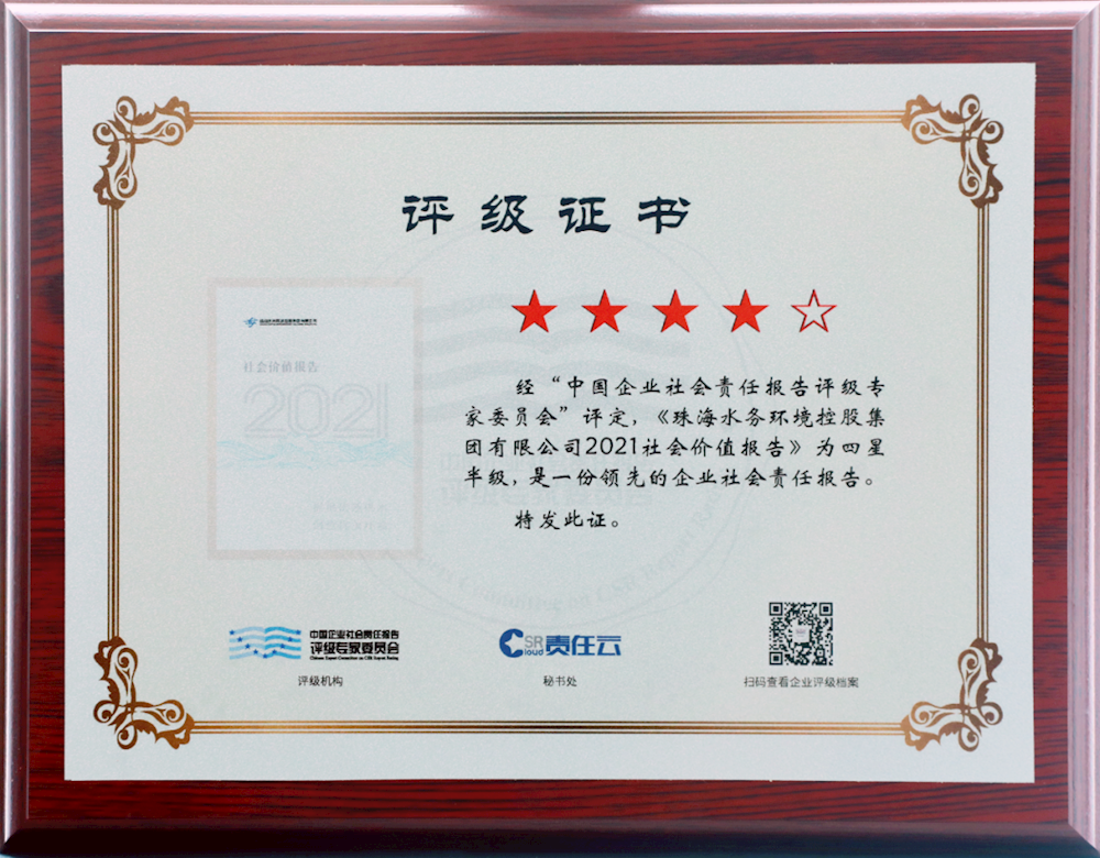 經(jīng)過十年錘煉,珠海水控集團作為粵港澳大灣區(qū)水務(wù)環(huán)保行業(yè)的大型國有企業(yè),在擔(dān)當(dāng)國企社會責(zé)任,踐行國企社會價值領(lǐng)域堅持不懈地努力,獲得了更多的社會認(rèn)可?!爸袊髽I(yè)社會責(zé)任報告評級專家委員會”根據(jù)中國社科院《中國企業(yè)社會責(zé)任報告指南(CASS-CSR4.0)》《中國企業(yè)社會責(zé)任報告評級標(biāo)準(zhǔn)2020》權(quán)威依據(jù),經(jīng)過嚴(yán)格的評審過程,對《珠海水控集團2021年度社會價值報告》做出四星半級的評級結(jié)果,認(rèn)為“是一份領(lǐng)先的企業(yè)社會責(zé)任報告”。
