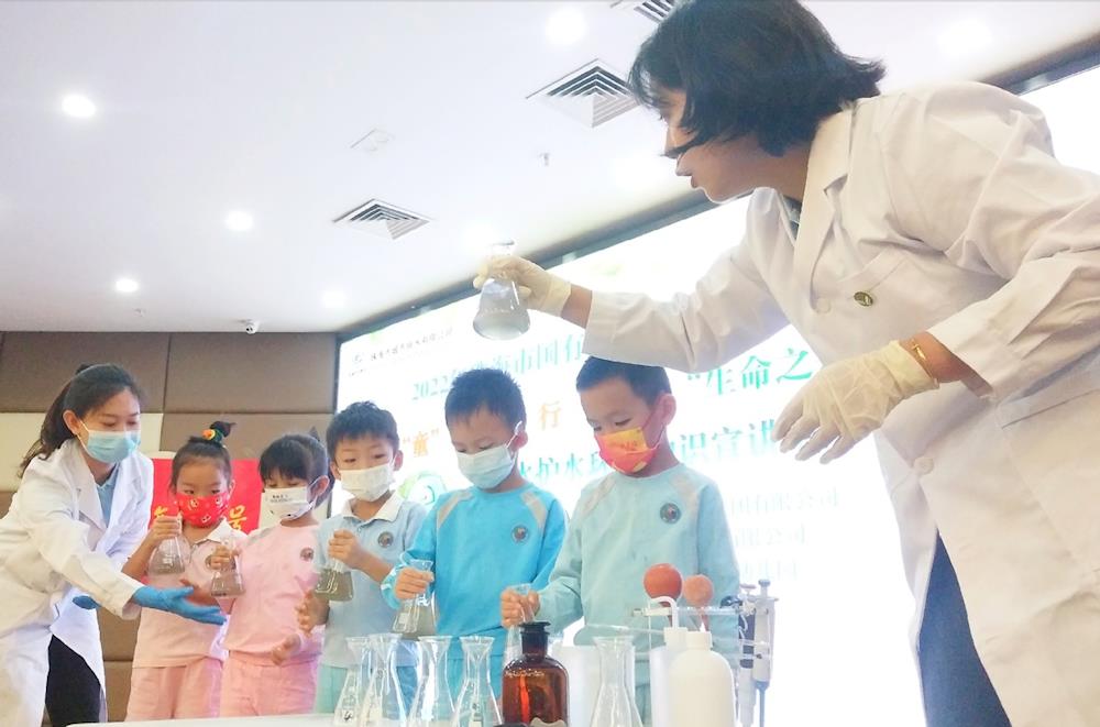 “污水變成清水前需要經(jīng)過怎樣的處理?為什么臟水不能喝?小朋友知道里面都有哪些壞東西嗎……”在節(jié)水護水環(huán)保課堂上,為了便于孩子理解接受,宣講人員精選教案,通過卡通動畫視頻方式宣講環(huán)保知識,介紹污水處理過程,講解各種藏匿在污水中的有害微生物,并通過現(xiàn)場實驗,直觀展示污水由黑變清的過程,通過實驗互動傳播城市文明理念,增強孩子的節(jié)水意識。