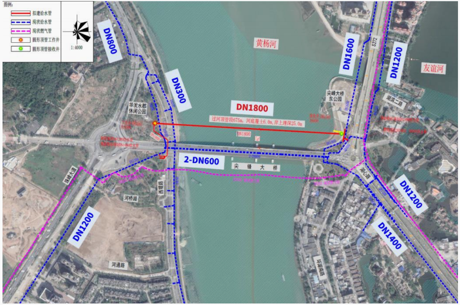本項目建設(shè)內(nèi)容包括尖峰大橋處新建1根DN1800給水主干管約925m;東岸與省道S272現(xiàn)DN1600供水主干管接駁,聯(lián)通現(xiàn)狀DN800給水管,并預留后期規(guī)劃DN1800給水管接駁口;西岸與西堤路現(xiàn)狀DN1200供水主干管接駁、預留DN1600遠期規(guī)劃供水管接駁口。