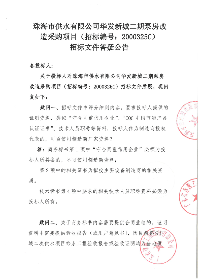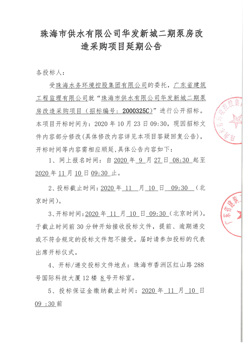 珠海市供水有限公司華發(fā)新城二期泵房改造采購項目延期公告