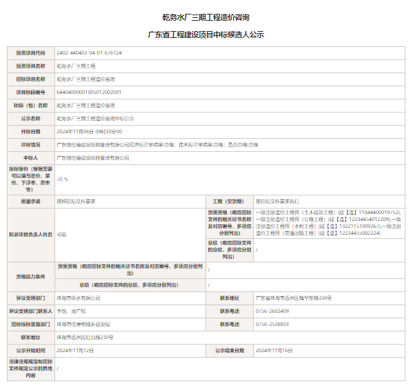 乾務(wù)水廠三期工程造價(jià)咨詢中標(biāo)公示