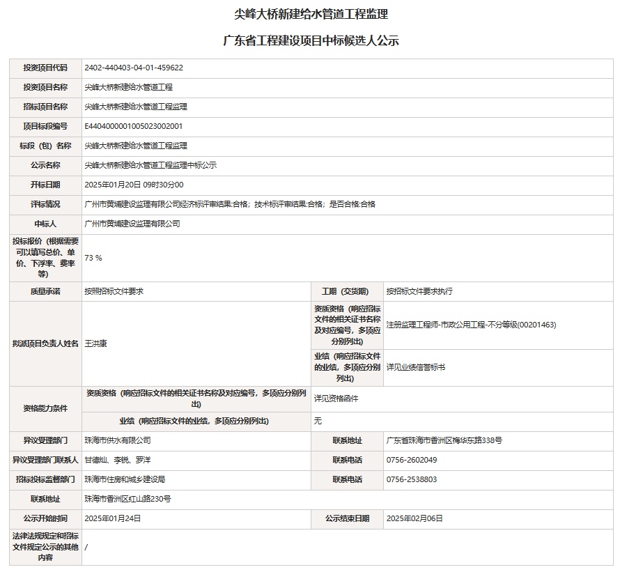尖峰大橋新建給水管道工程監(jiān)理中標候選人公示